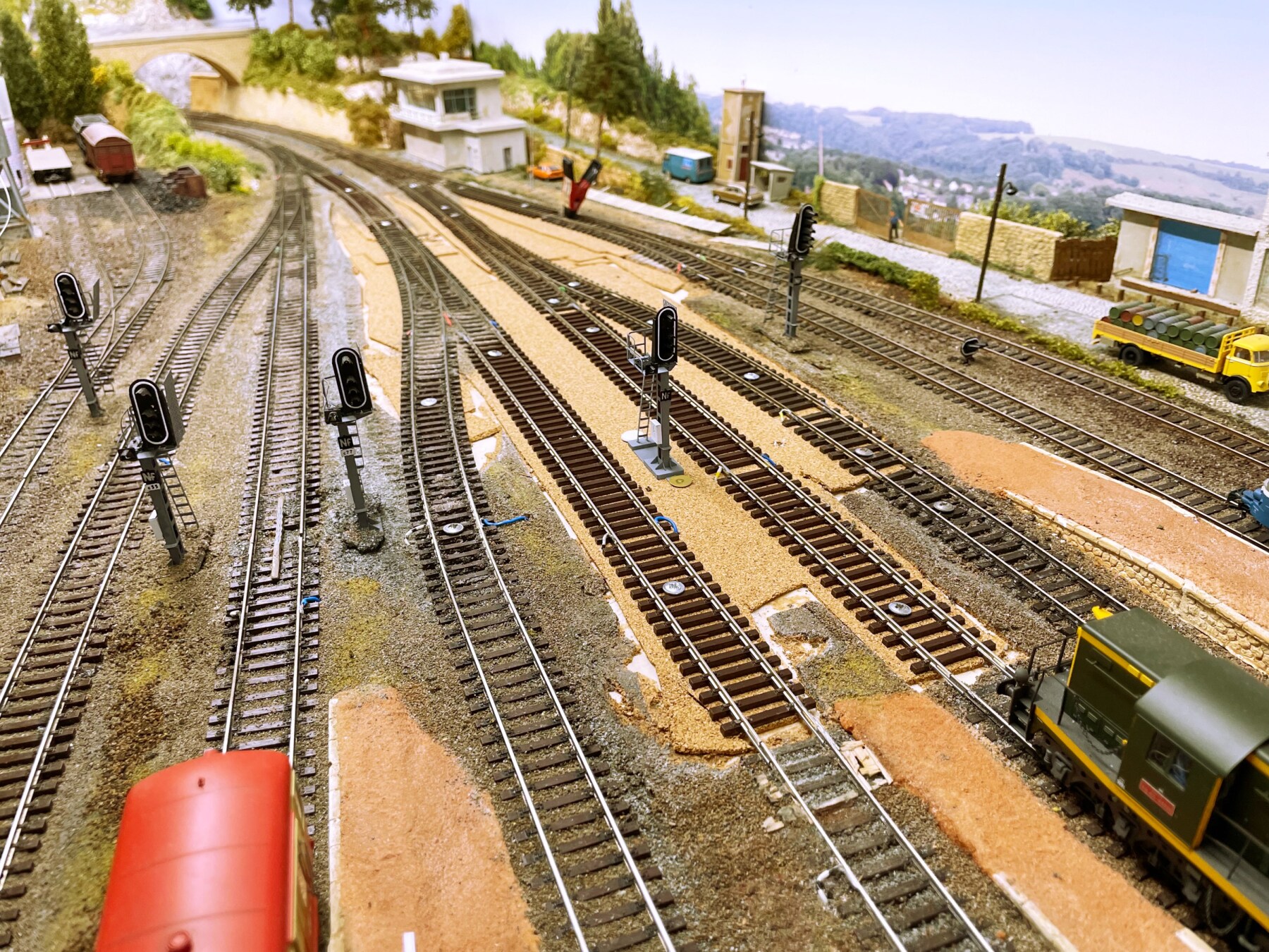 Een overzicht van de werkzaamheden, een aantal wissels zijn verwijderd en langere versies zijn teruggeplaatst. Het sporenverloop is vloeiender en het rijdt nu beter, tot nu toe nog geen ontsporingen. Nog een paar laatste tests met zowel langere als ook korte locs, en dan kan ik beginnen met installeren van Rocrail (na het ballasten dan).
