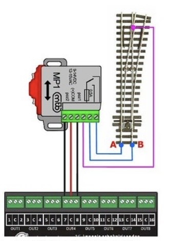Dat klopt niet helemaal. Een MTB motor kost € 18,- en een servo € 3,25 per stuk. Dus inderdaad 5 tot 6 keer duurder. Maar de reductie van het aantal draden is toch beperkter; hooguit wat korter. Er zijn nog steeds zes draden per wissel nodig.