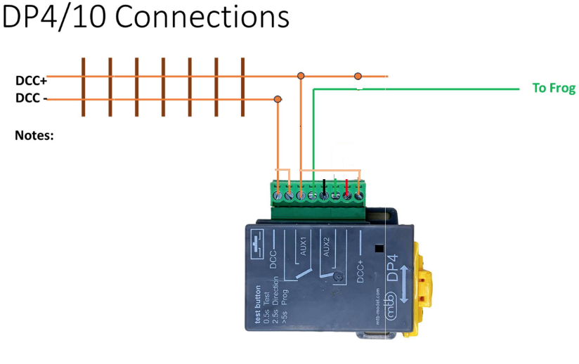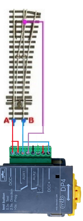 Ik heb dit plaatje uit de handleiding gepakt en aangepast, er moeten idd 5 draden in, maar die DCC draden kan je doorlussen bij de motor zelf. Dus dat telt als 3, 2 DCC draden en 1 frog draad. Hierbij komt dat de motor onder de wissel zit. De Frog draad hoeft dus niet naar een relais toe op de andere kant van de module. En de DCC draden kan je in principe direct aftappen van de wissel. Dus de drie draden die je nodig heb, zijn ook niet langer dan 5cm. Ik zou dit bijna draadloos noemen.