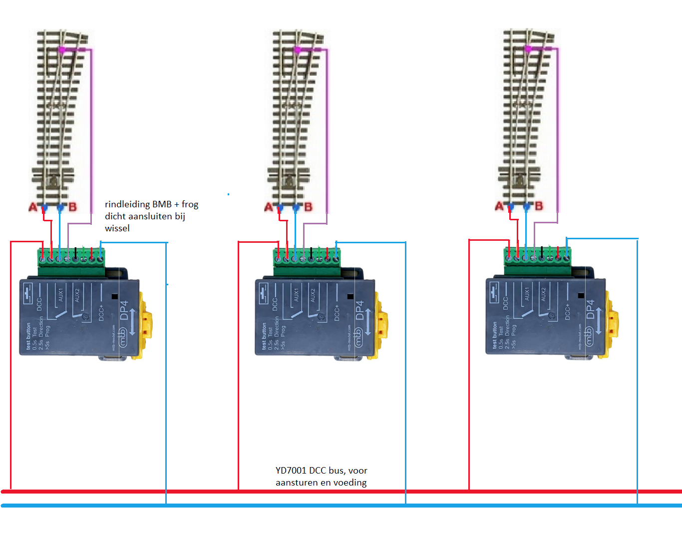 Maar verstandiger lijkt het (zoals Hans heeft gedaan) aparte DCC-circuits te hebben om verstoringen te isoleren en dan worden het wat meer draden.