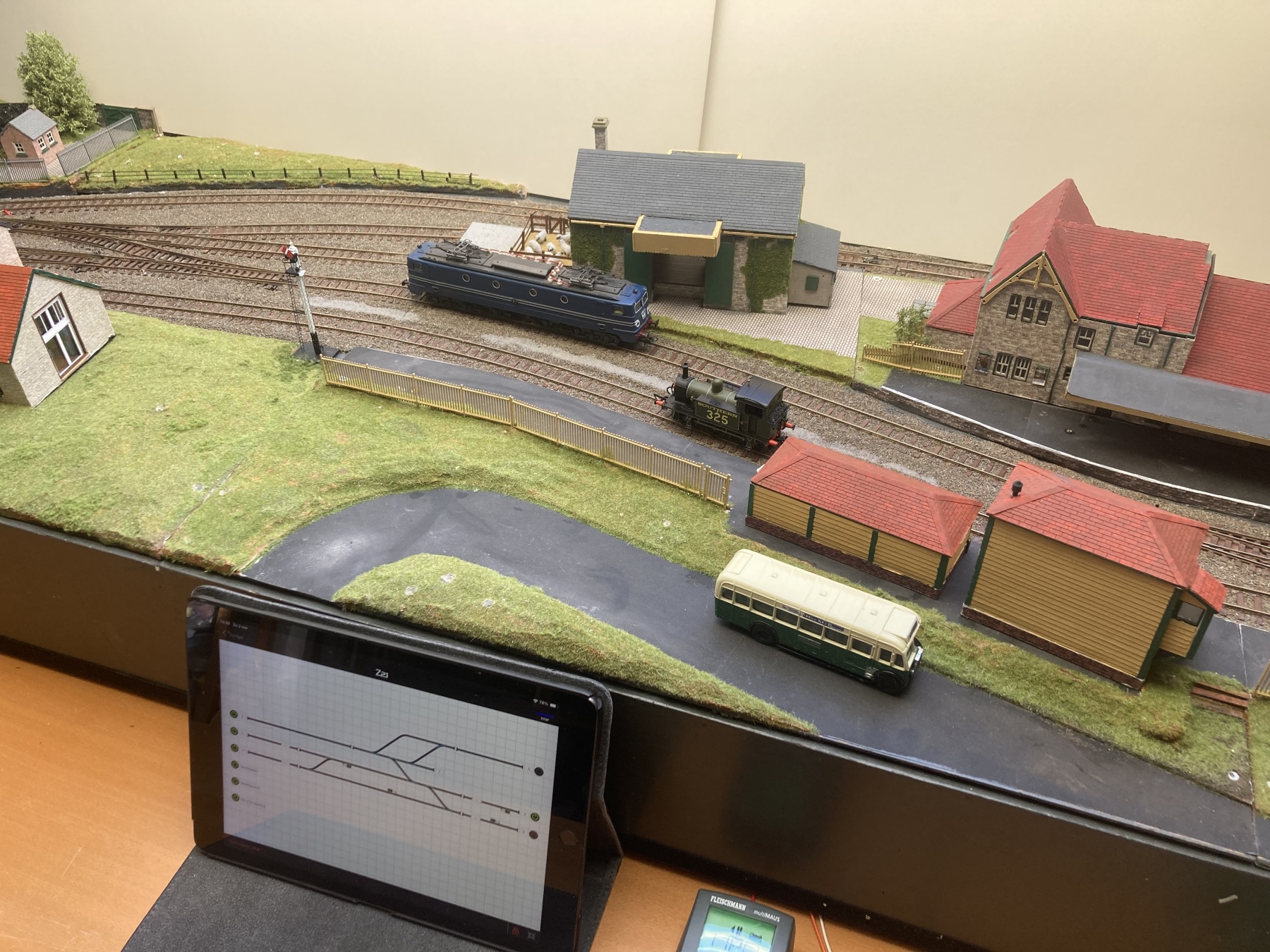Het heeft even wat tijd gekost. Alle draadjes zitten vast onder mijn BMB Modulebak. En alles werkt zoals bedoeld. Het enige dat nog ontbreekt, is de digitale keuze schakelaar voor DC/DCC.De besturing gaat via de YaMoRC YD7001 en een Fleischmann trafo. De wissels en rijwegen worden ingesteld via mijn iPad; de locs via de Roco muis. Beide mbv de Z21 App.Gr, Hans