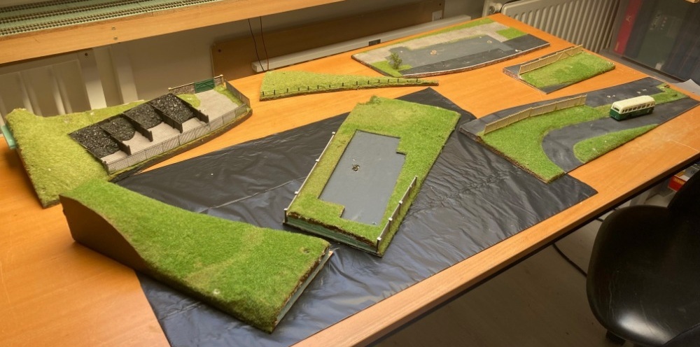 Gisteren heb ik bij BMB maatje Peter Jacobs nieuw gras gelegd op mijn puzzelstukken. Mijn grasmaster bleek uiteindelijk niet stuk, maar er zit een te grof zeefje op voor de fijne grasvezeltjes van 4mm. Het begrassen ging met het apparaat van Peter dus wel wat beter. Hieronder zie je de zeven puzzelstukken bij elkaar liggen, zonder gebouwen en bomen. De komende dagen pak ik ze allemaal even aan.