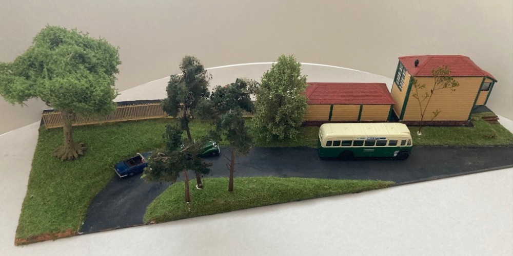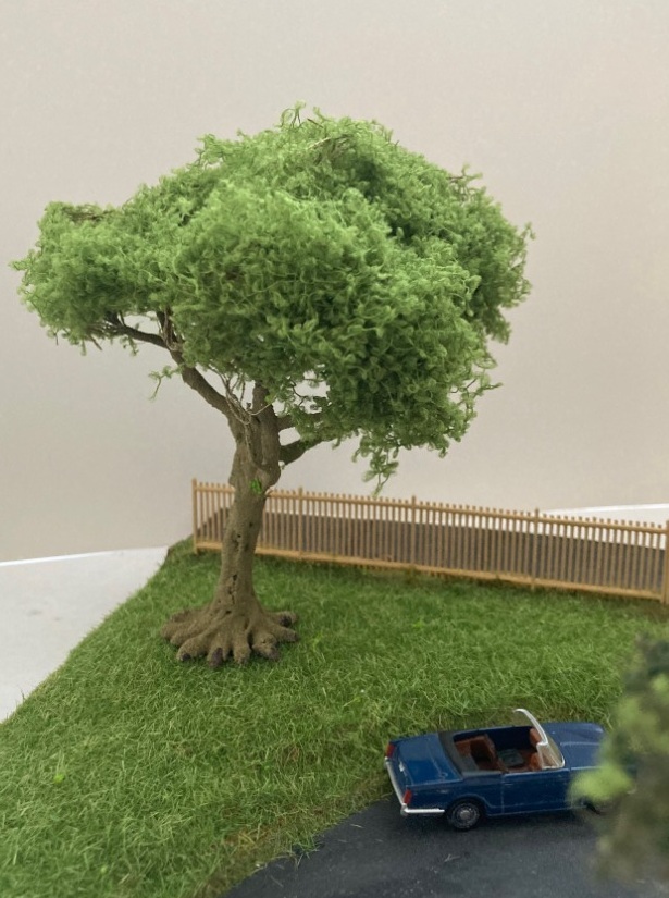 Helemaal links staat een boom die ik nog niet eerder heb gebruikt. Ik heb deze gekocht bij Temu. Per drie kosten ze geen drol: € 2,- per stuk. Toen ik hem ontving, dacht ik "wat een lelijk exemplaar". Maar ik heb hem ontdaan van de plastic-kleurige foliage en hield een prima boomtrunk over. Keurig gemaakt van in elkaar gedraaid ijzerdraad en voorzien van een laagje gips o.i.d. Kortom voor weinig een prima stam. Vervolgens heb ik op de trunk bekleed met een dot kunstmos. Snel en efficiënt.