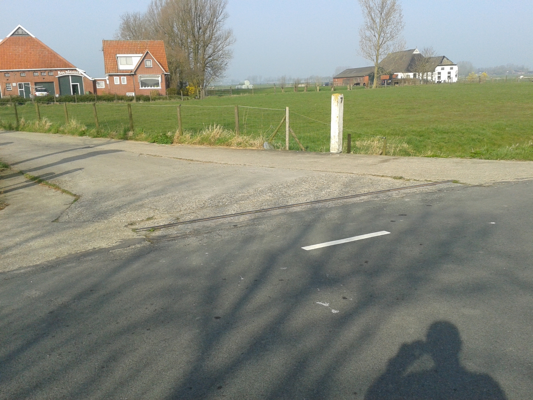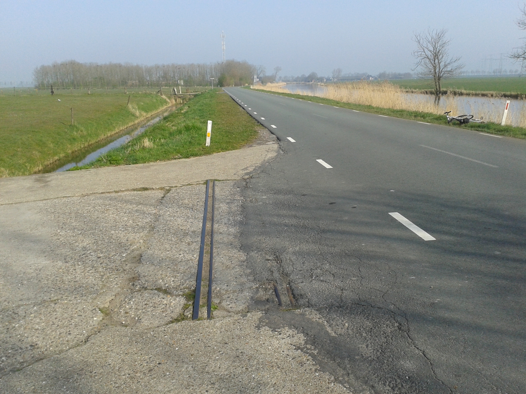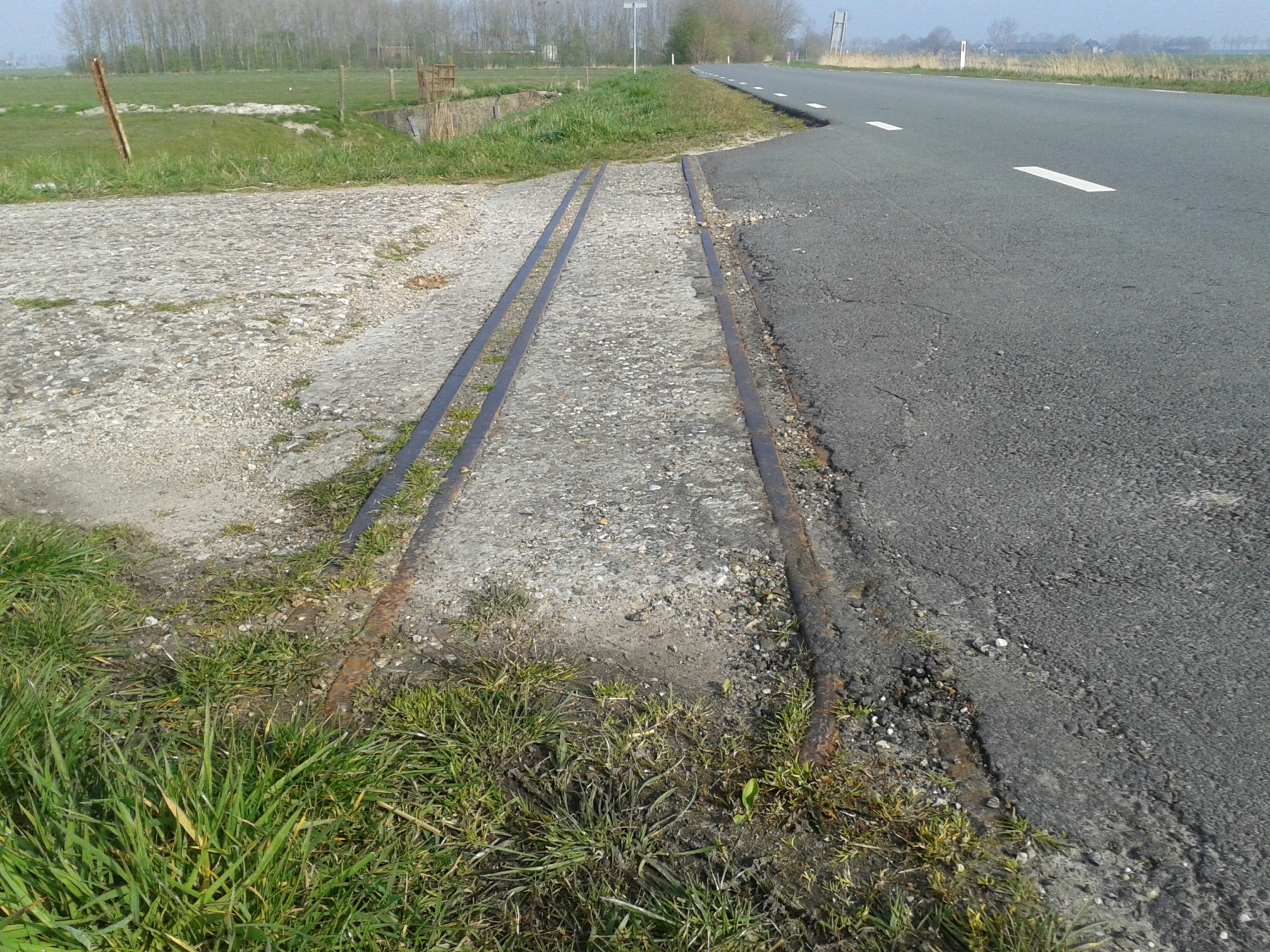 In maart 2014 fietste ik in ‘mijn’ provincie Groningen vanaf de Stenen Til in noordelijke richting langs het Aduarderdiep. Onderweg trof ik er nog resten aan van het smalspoor van de rond 1970 stilgelegde Steenfabriek Feerwerd. Onderweg, ter hoogte van De Brillerij, konden de treinen kruisen. Ik heb het nagemeten: 60 cm spoorwijdte.